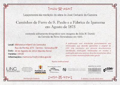 É com enorme prazer que convidamos a todos para participarem no próximo dia 30 de agosto de 2012, às 19h30, na Biblioteca Infantil de Sorocaba, do lançamento da reedição da obra "Caminhos de Ferro de S. Paulo e a Fábrica de Ipanema em agosto de 1875", de autoria de José Ewbank da Camara. A primeira edição dessa obra foi produzida em 1875 e apresenta um cenário sobre as ferrovias implantadas no Estado de São Paulo, trazendo também uma descrição dos trabalhos de reestabelecimento da Real Fábrica de Ferro de São João do Ypanema. Esta segunda edição, organizada por Luciano Bonatti Regalado com o apoio de Adolfo Frioli e André Guilherme, traz um aditamento fotográfico composto por imagens da Estrada de Ferro Sorocabana produzidas em 1885 por Júlio W. Durski.